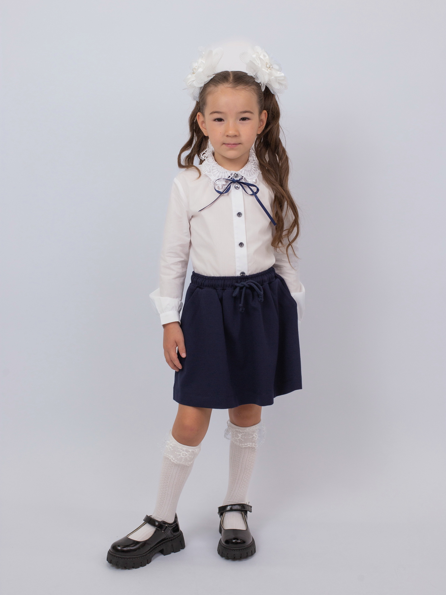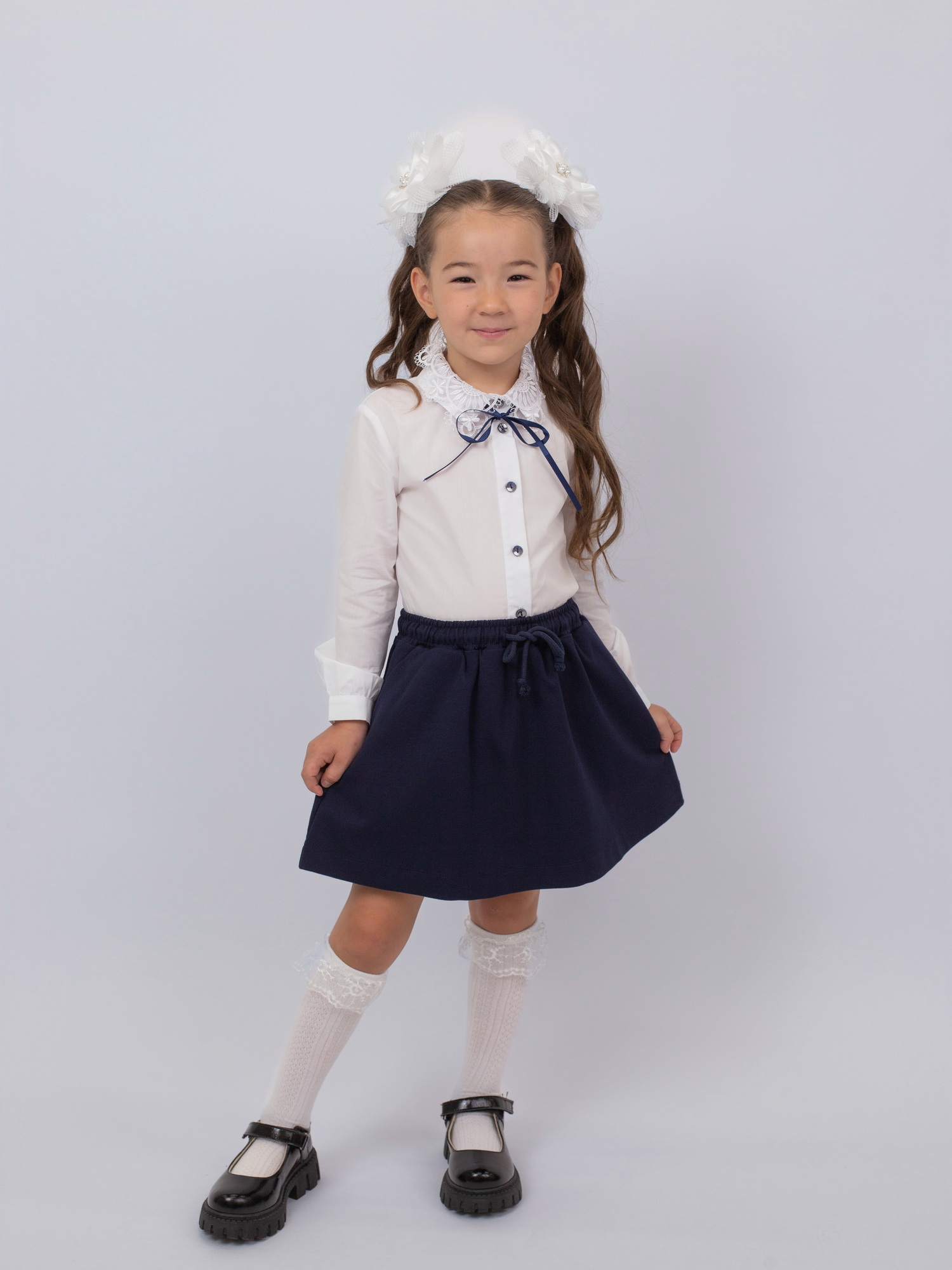 Отлично сочетается с сарафанами, юбками и классическими школьными брюками. Идеальный выбор как для учебных будней, так и для торжественных школьных мероприятий.