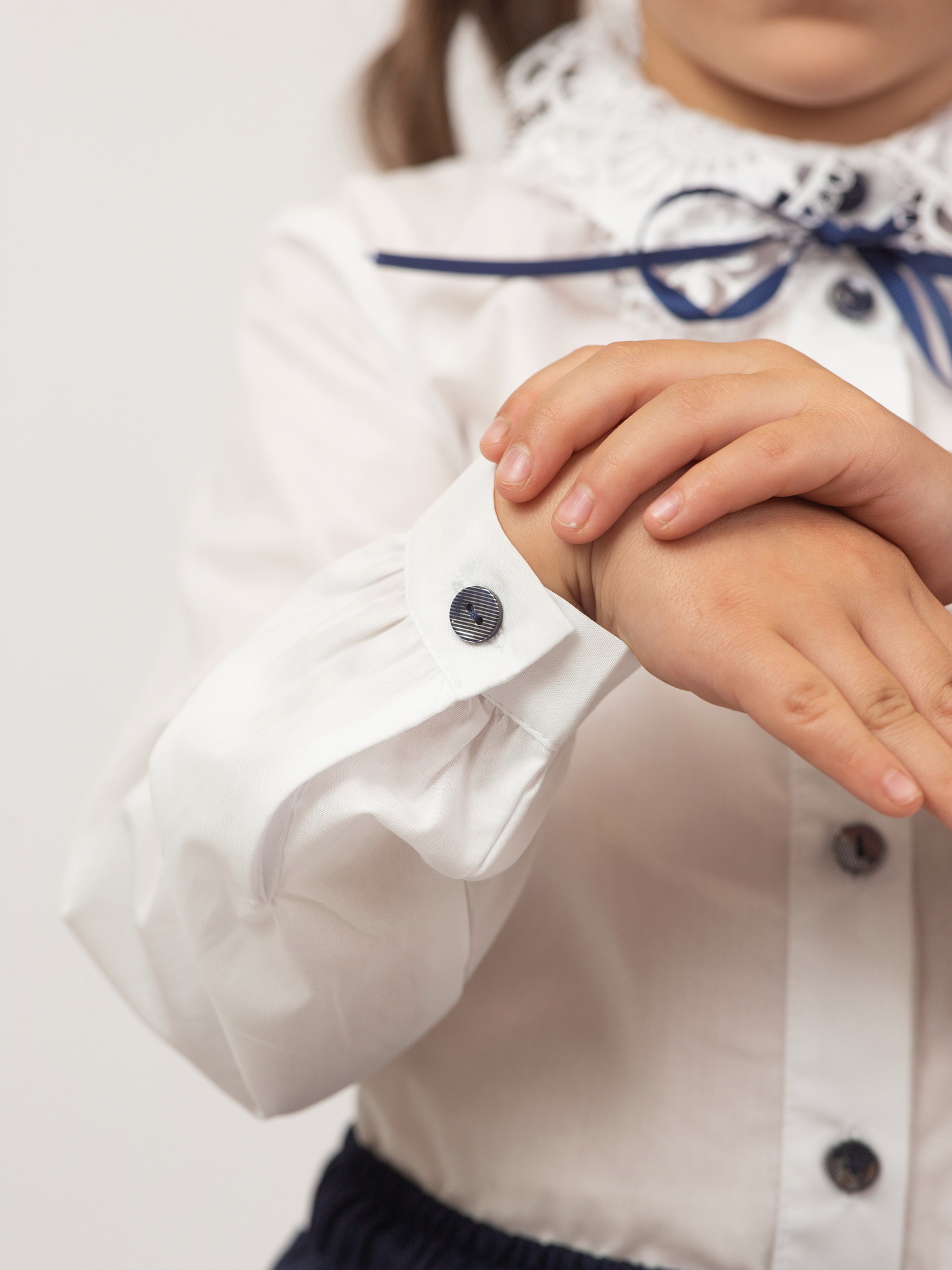 Выполнена из качественного материала — сочетания хлопка и полиэстера, что обеспечивает комфорт в носке, воздухопроницаемость и лёгкость в уходе. Блузка украшена ажурным воротником, который придаёт образу нежность и изысканность. Дополняет дизайн аккуратная лента на шее и декоративные пуговицы по центру, подчеркивающие стиль и аккуратность изделия.