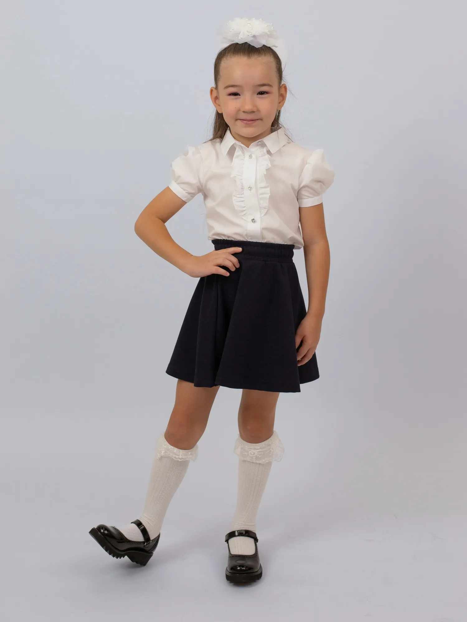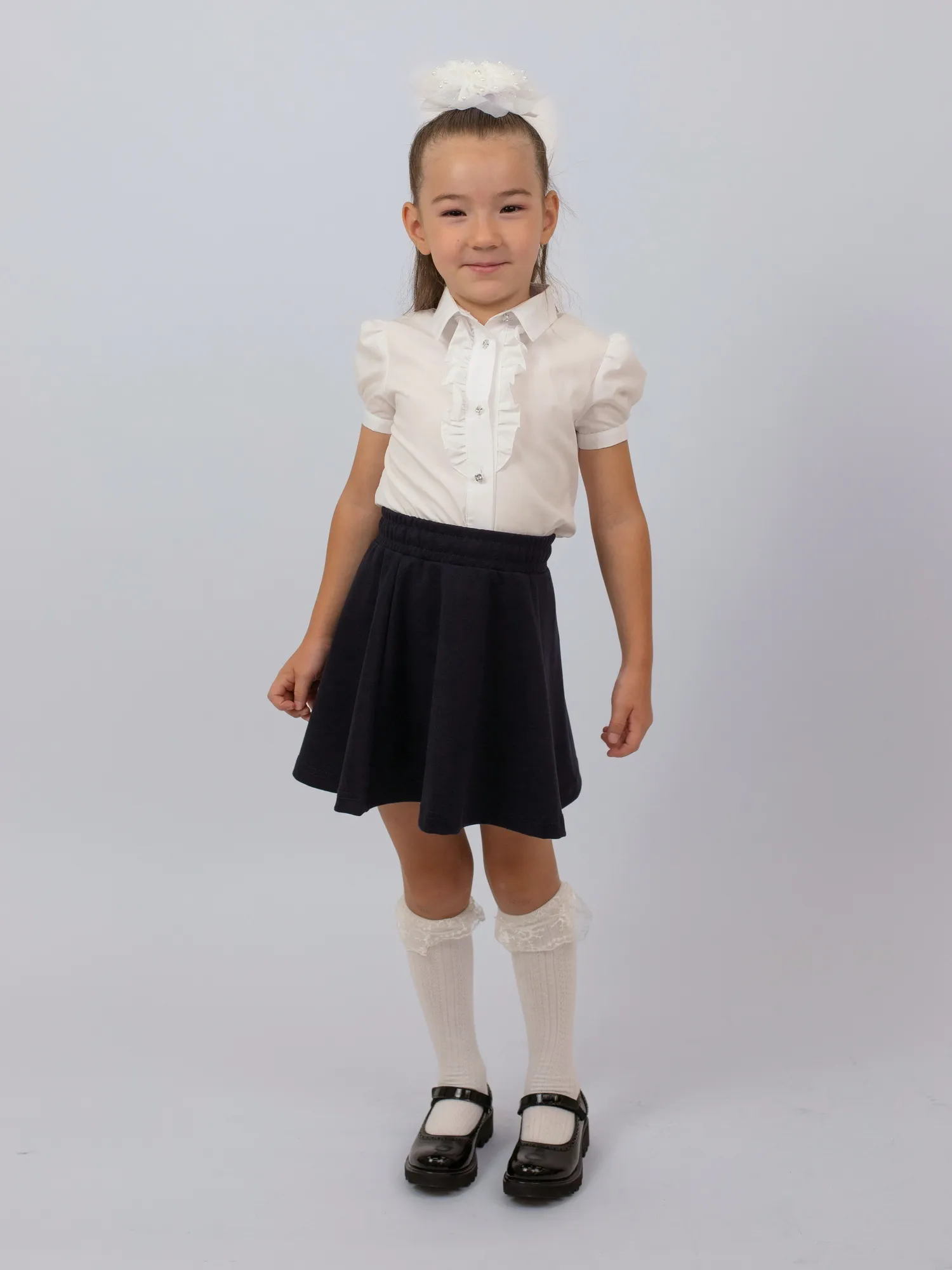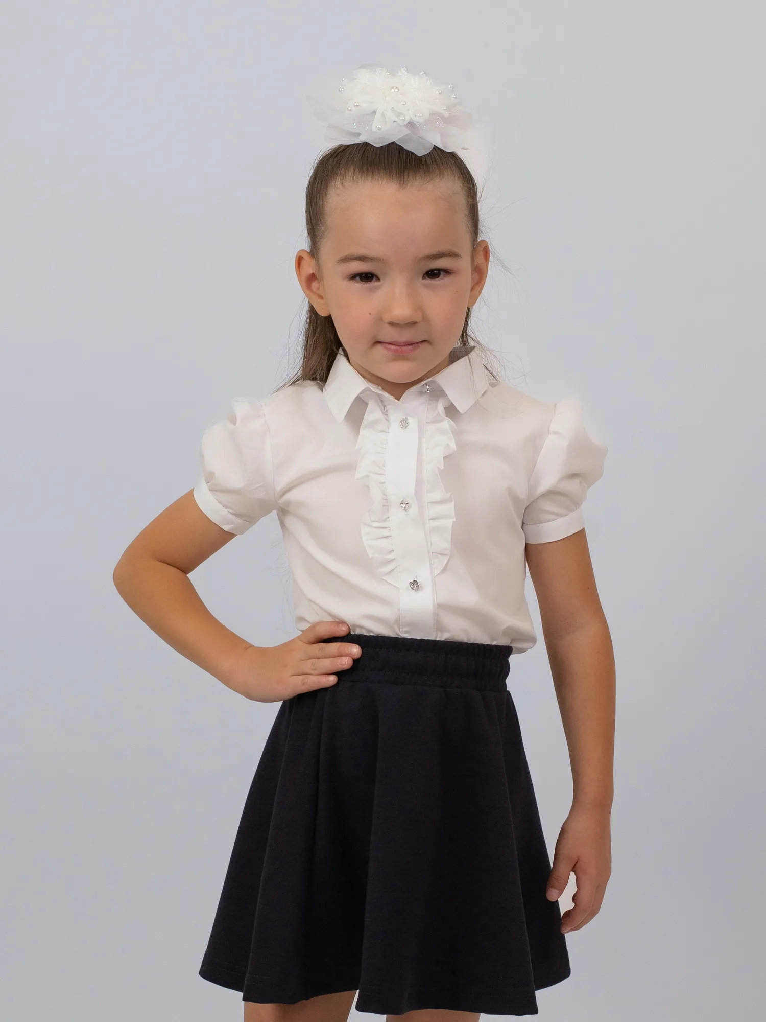 Нарядная и комфортная блузка с короткими рукавами-фонариками станет отличным вариантом для школы. Модель выполнена из мягкого и практичного материала — хлопка с добавлением полиэстера, что обеспечивает удобство в носке и лёгкость в уходе. Рукава-фонарики придают образу нежность, а декоративные рюши на груди добавляют изящества и делают модель особенно стильной. Отличный выбор для школьных будней и торжественных дней.