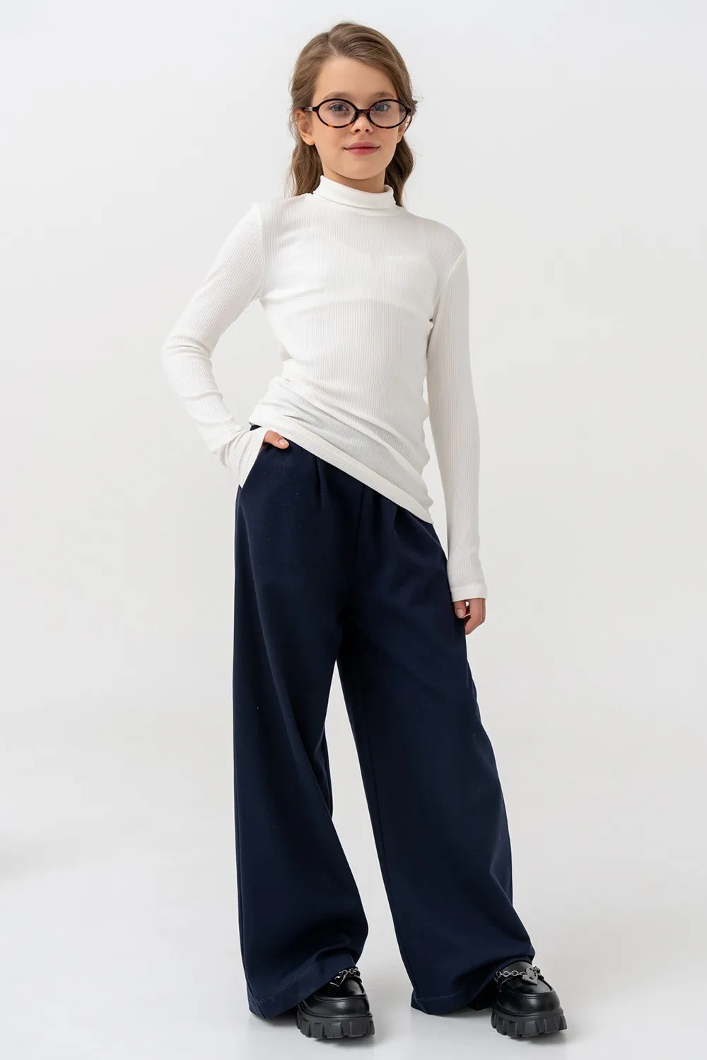 | Элегантные брюки-палаццо с мягкими защипами на талии создают свободный силуэт и визуально вытягивают фигуру. Модель выполнена из плотного, держущего форму материала. Широкие прямые штанины не сковывают движений, обеспечивая комфорт в течение дня. Идеальны для школы, торжественных мероприятий и повседневного стиля. |