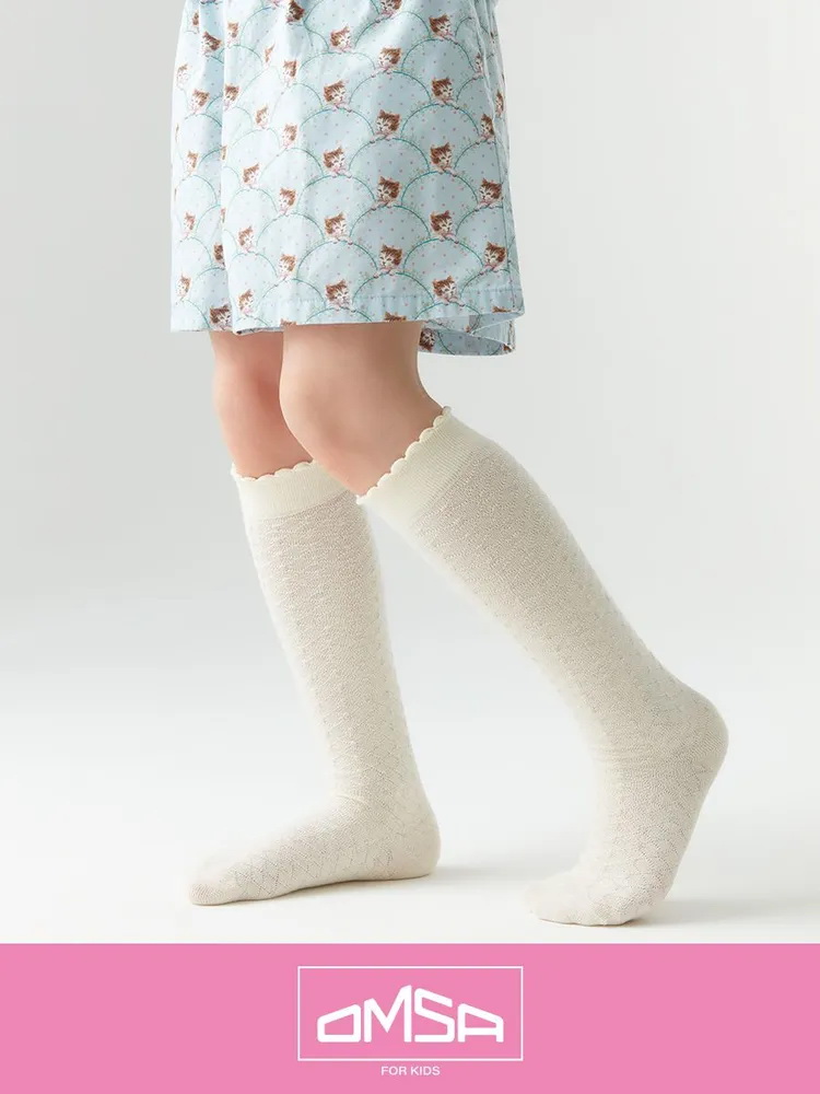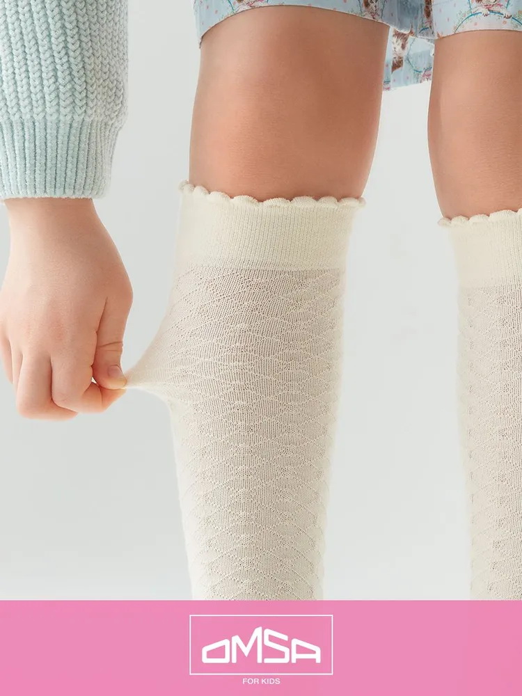 Ажурные гольфы для девочек с рисунком в виде ромбов и оригинальным декоративным бортом. Выполнены из мягкого дышащего хлопка с добавлением полиамида и эластана. Материал приятен к телу, впитывает влагу и подходит для чувствительной кожи. Плоский шов и мягкая эластичная резинка обеспечивают комфорт при носке. Гольфы хорошо облегают, не теряют форму и цвет после стирки.