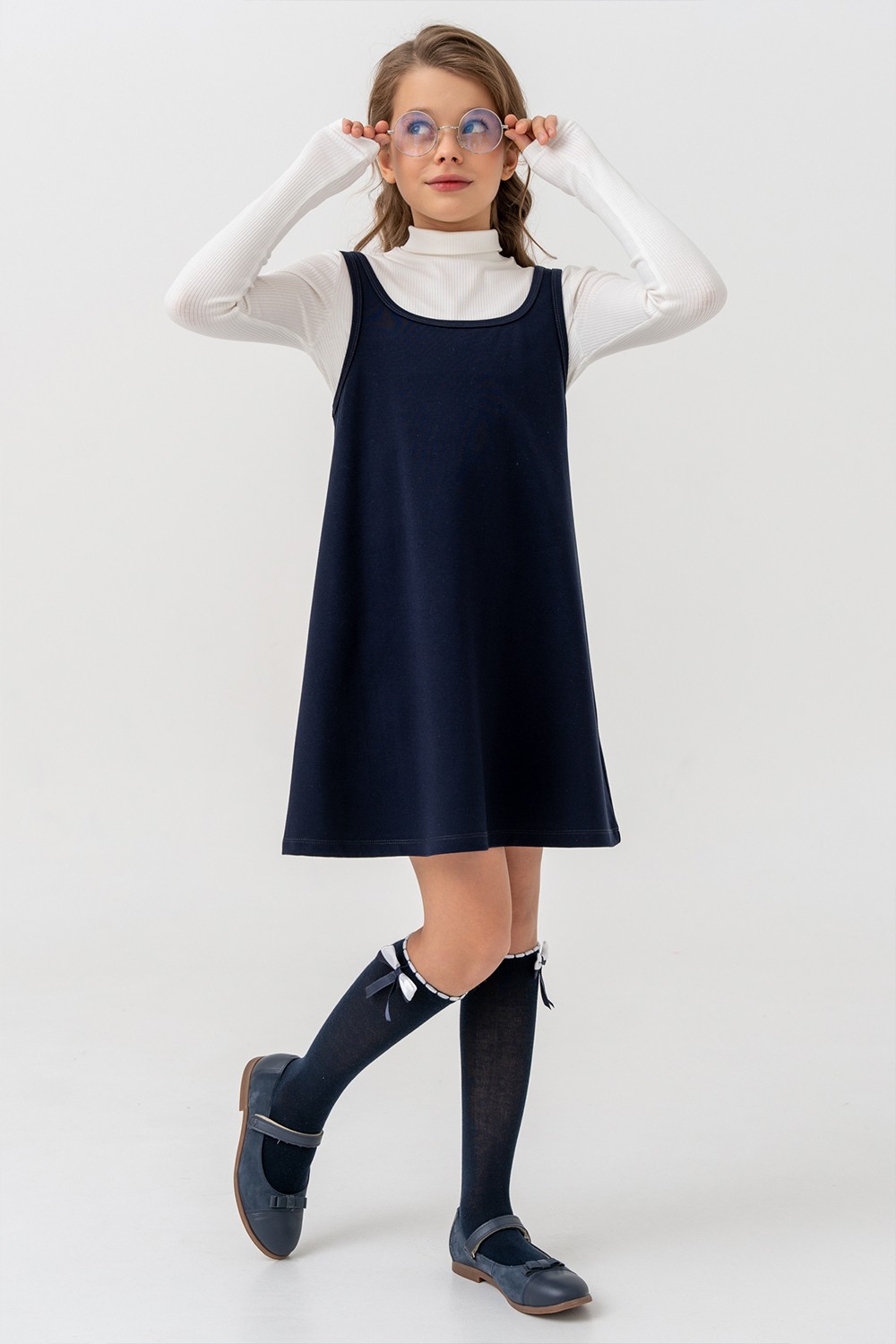 Стильный сарафан прямого кроя с лаконичным передом и акцентной деталью на спинке. Декоративный элемент делает образ оригинальным, сохраняя при этом строгость школьного стиля. Удобная посадка и мягкий материал обеспечивают комфорт на весь день. Идеально сочетается с водолазками и блузками.