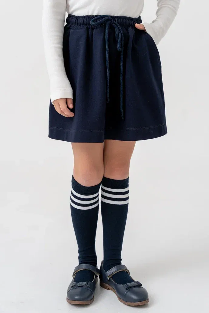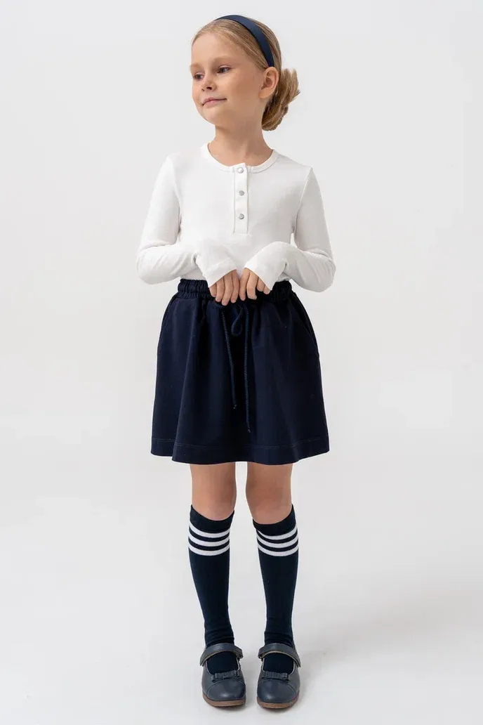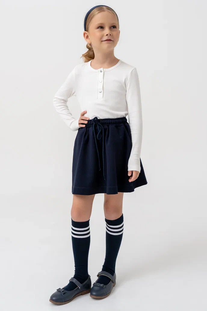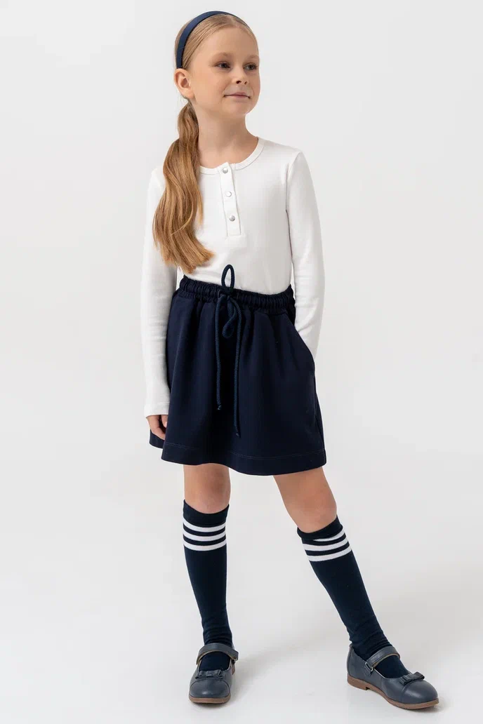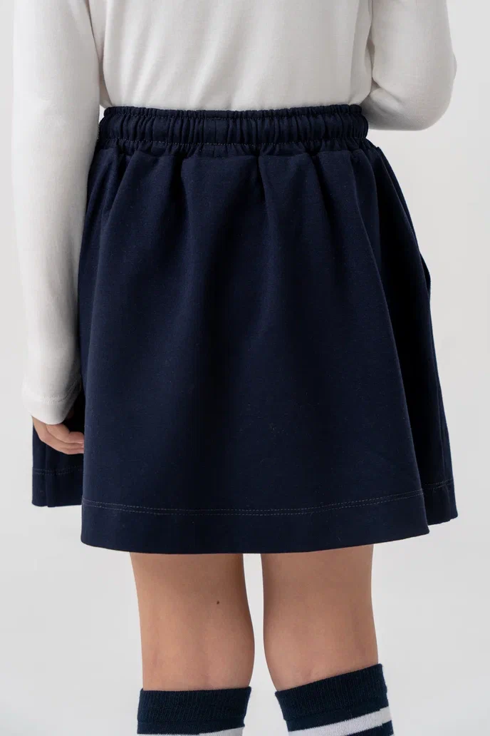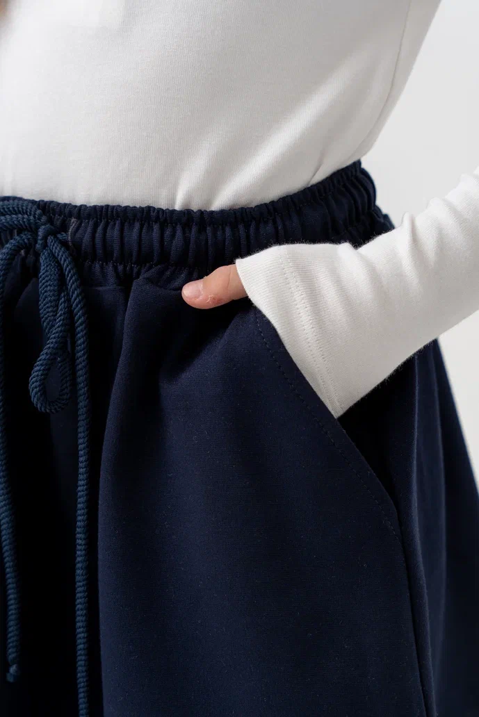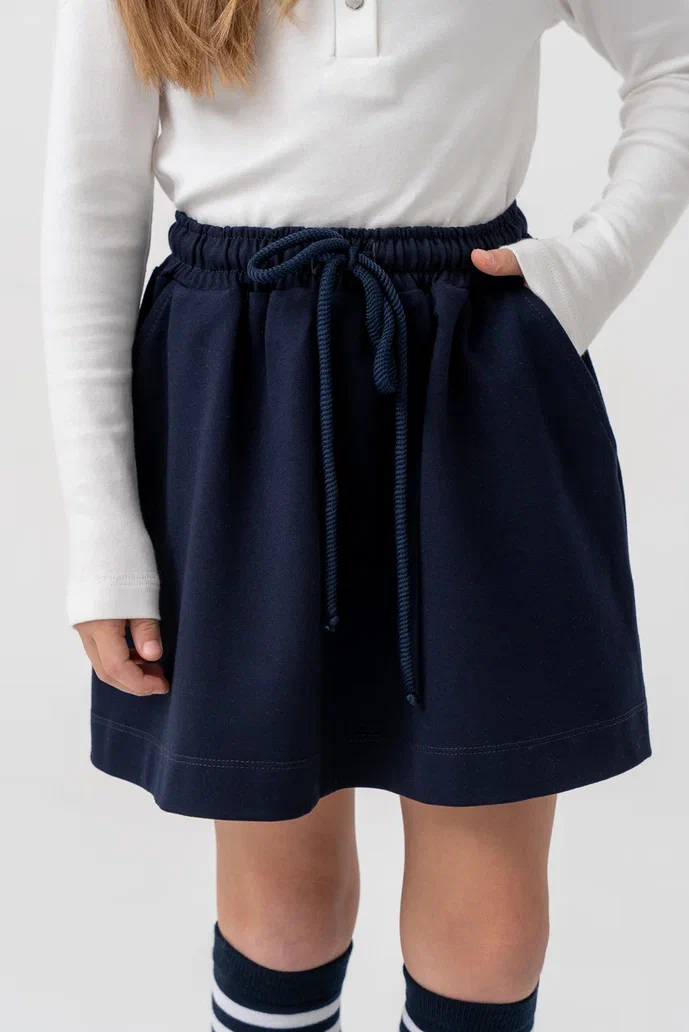 Юбка для девочек тёмно-синего цвета — удобная и стильная модель на каждый день. Изготовлена из мягкого трикотажного полотна, приятного к телу и комфортного в носке. Эластичный пояс с завязками обеспечивает удобную посадку, позволяя легко регулировать объём по талии. Функциональные боковые карманы делают модель ещё практичнее.Юбка отлично подойдёт как для школы, так и для прогулок, сочетаясь с водолазками, футболками, лонгсливами или жакетами.