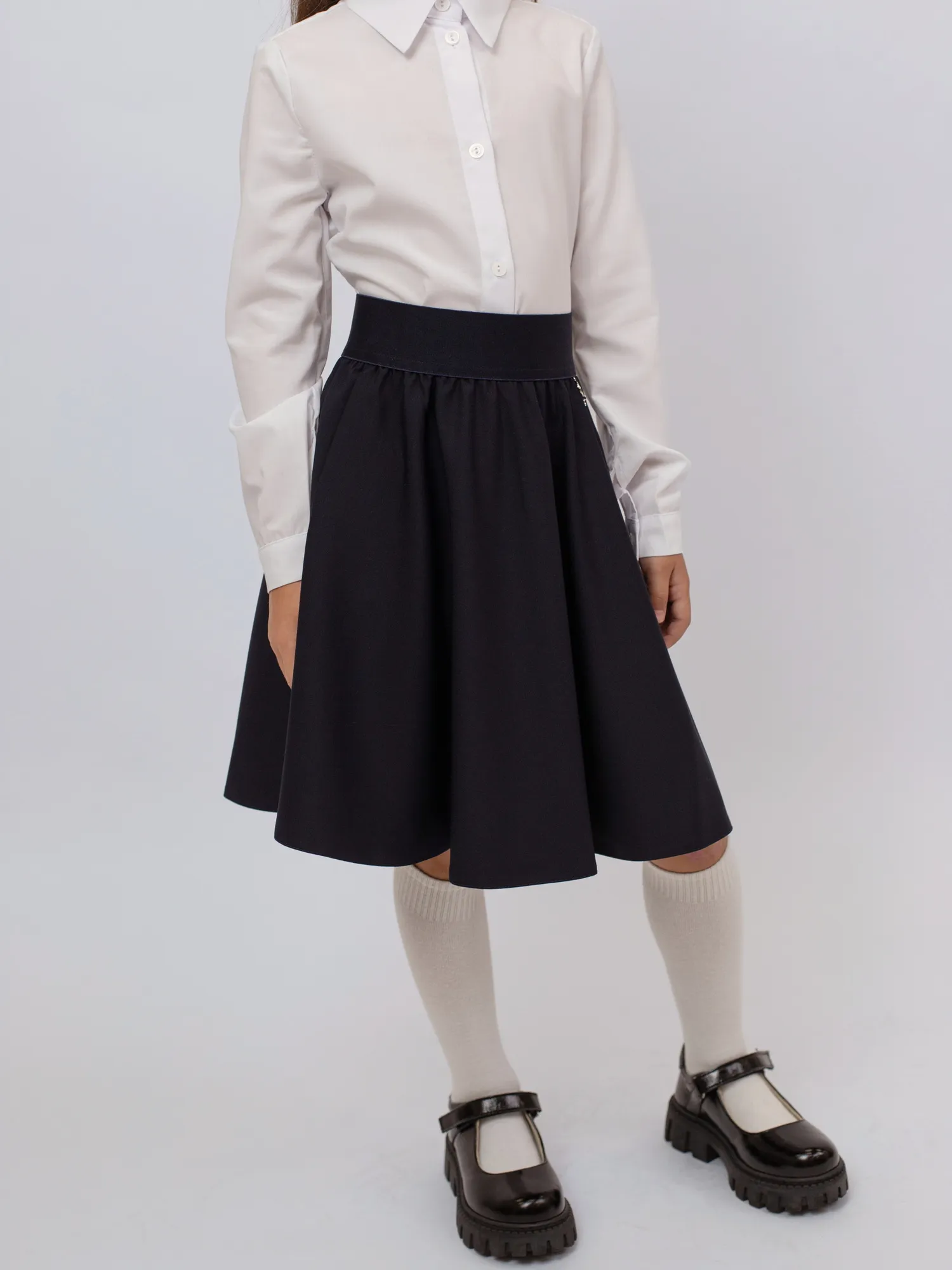 Юбка для девочек силуэта "полусолнце" — удобная и стильная модель на каждый день. Пояс выполнен из широкой ткацкой резинки в тон изделия, обеспечивая комфортную посадку. Карманы в боковых швах добавляют практичности, а декоративный шильд на поясе завершает образ.