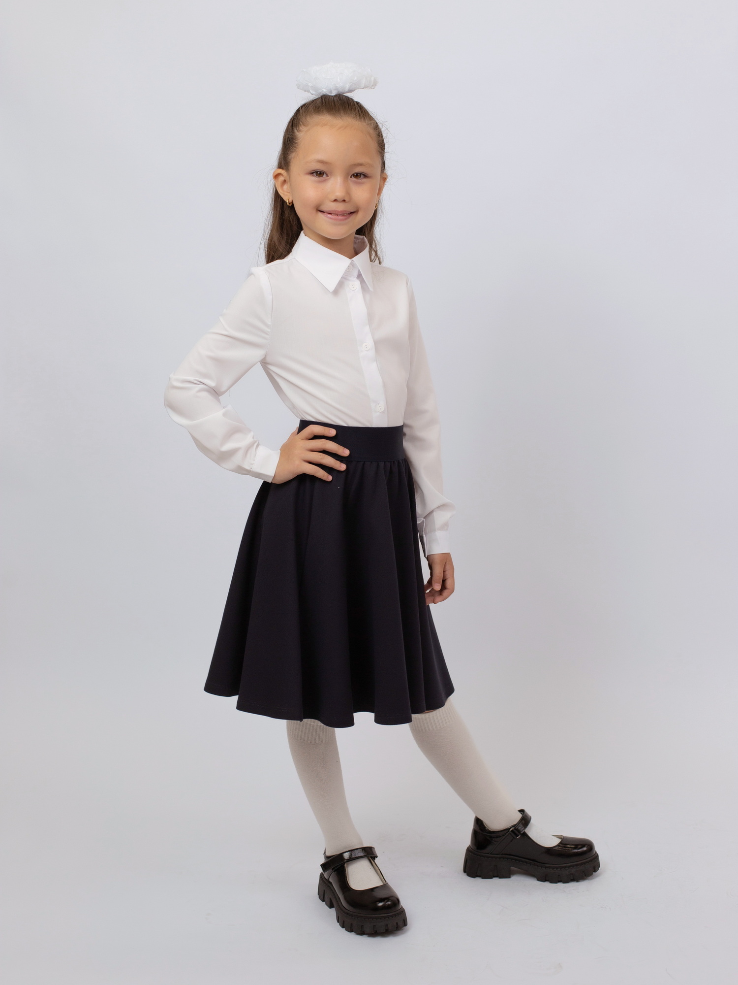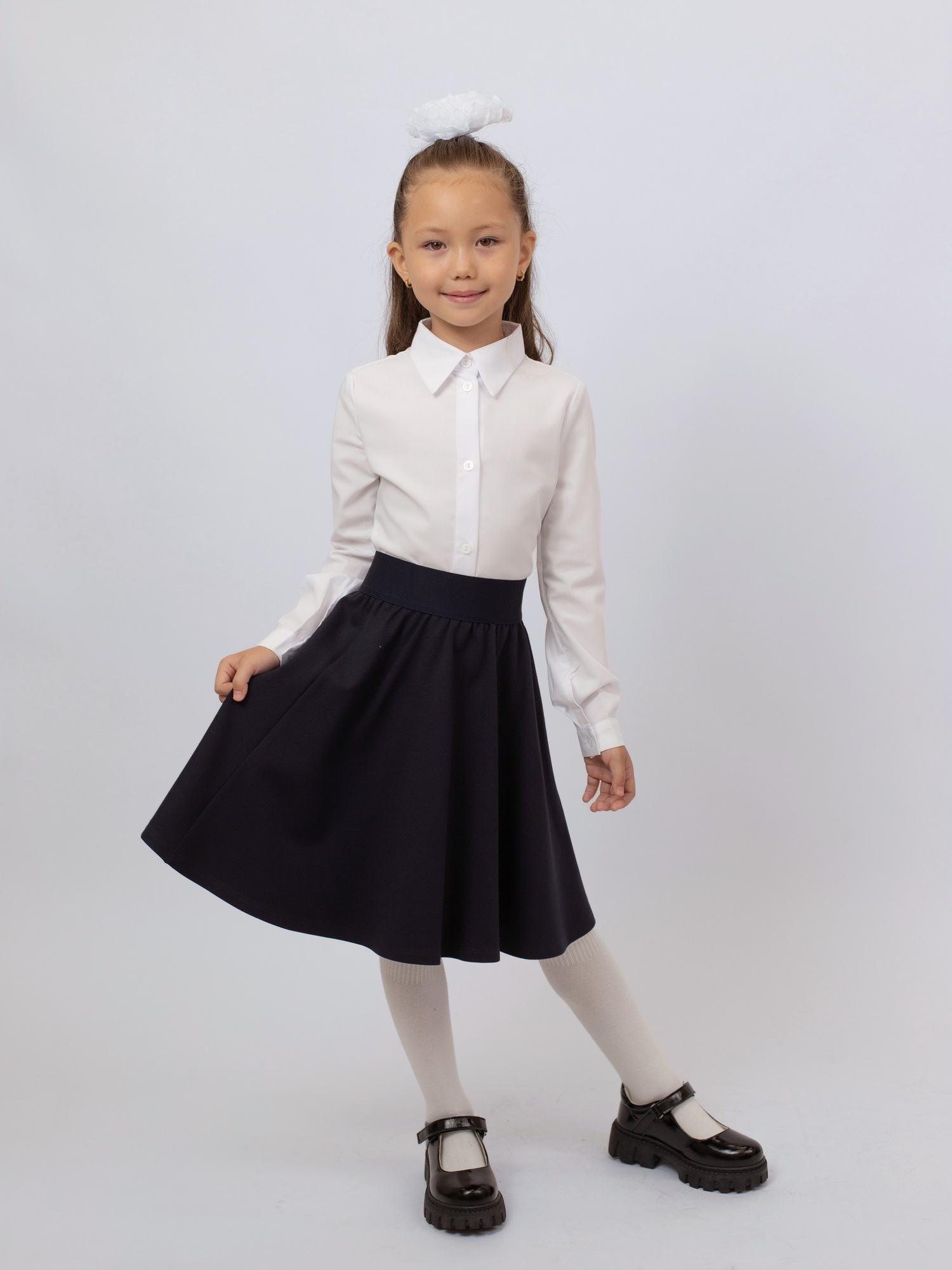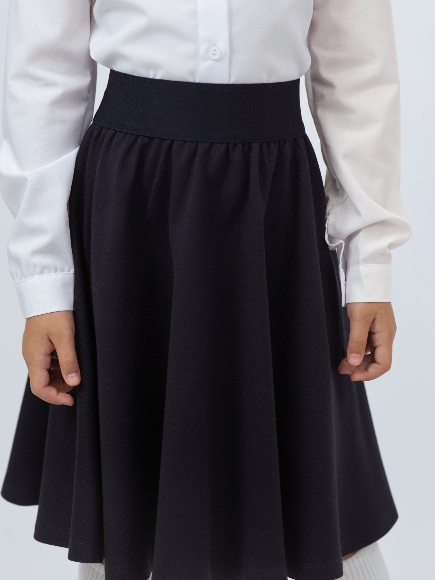 Юбка-полусолнце для девочек выполнена из мягкого трикотажа, обеспечивающего комфорт и свободу движений в течение дня. Пояс из широкой ткацкой резины в тон ткани надёжно фиксирует изделие на талии, не сдавливая. Элегантный акцент — пришивной металлический шильд — придаёт модели завершённый вид. Идеальный выбор для школы и повседневных образов.