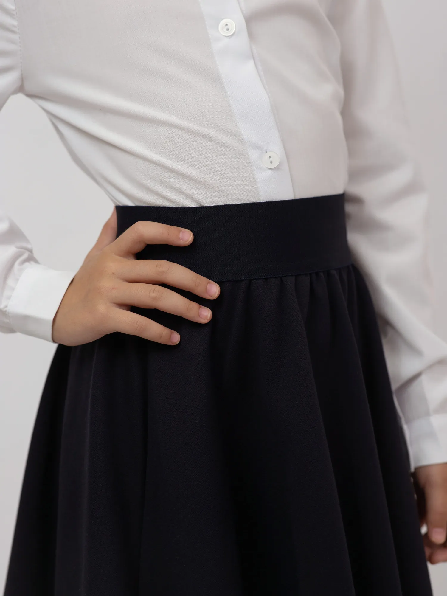 Юбка-полусолнце для девочек выполнена из мягкого трикотажа, обеспечивающего комфорт и свободу движений в течение дня. Пояс из широкой ткацкой резины в тон ткани надёжно фиксирует изделие на талии, не сдавливая. Элегантный акцент — пришивной металлический шильд — придаёт модели завершённый вид. Идеальный выбор для школы и повседневных образов.