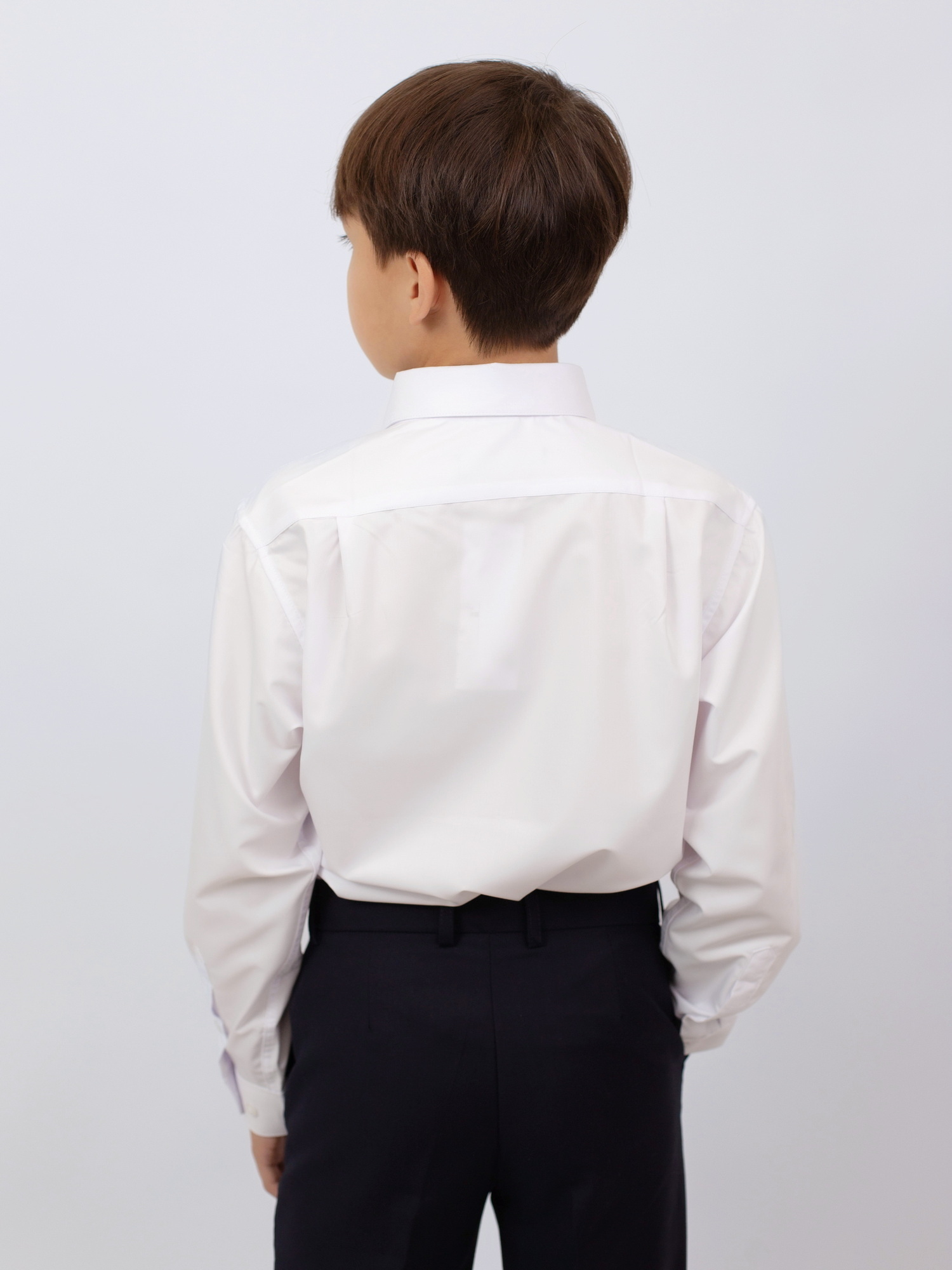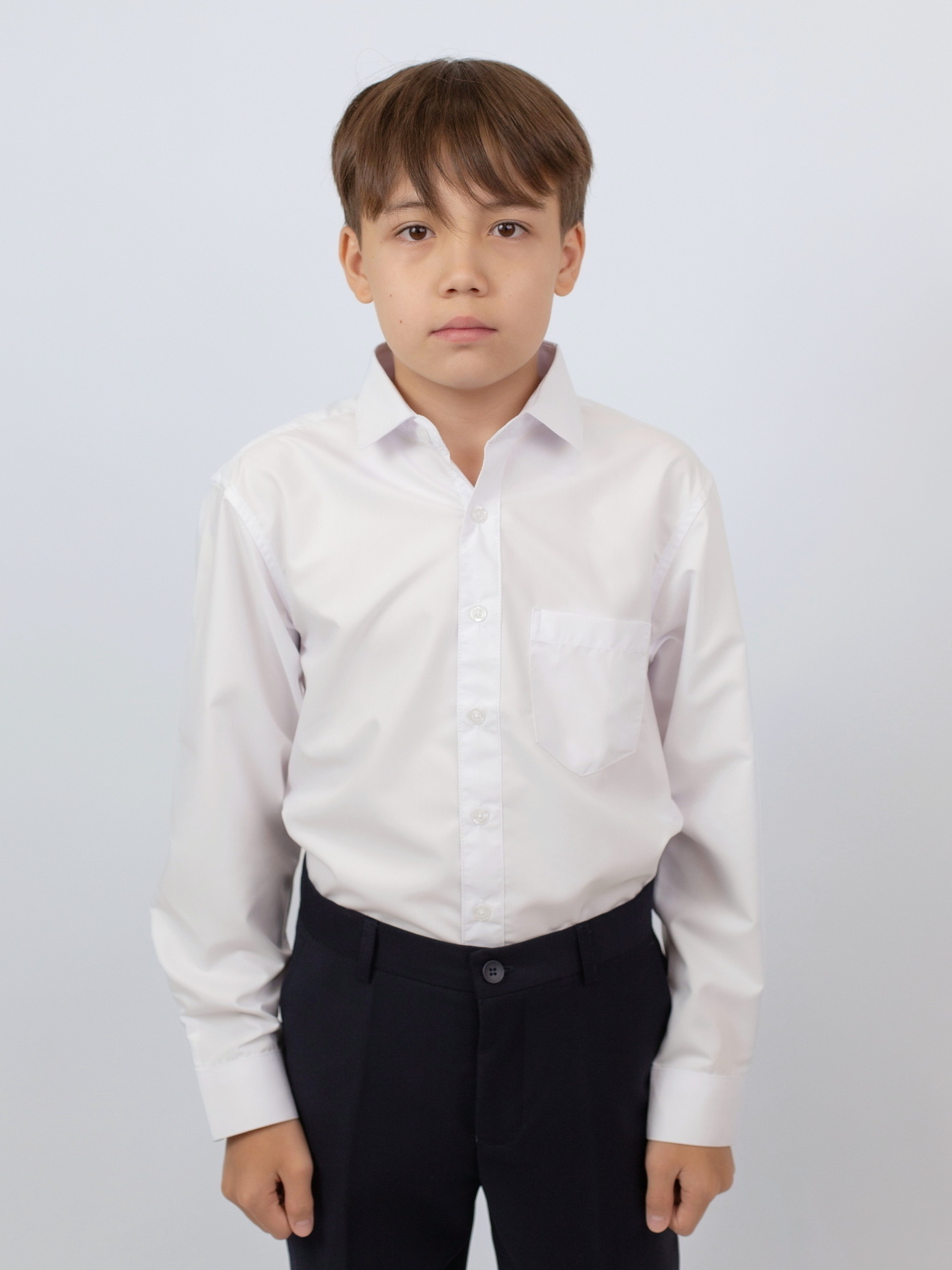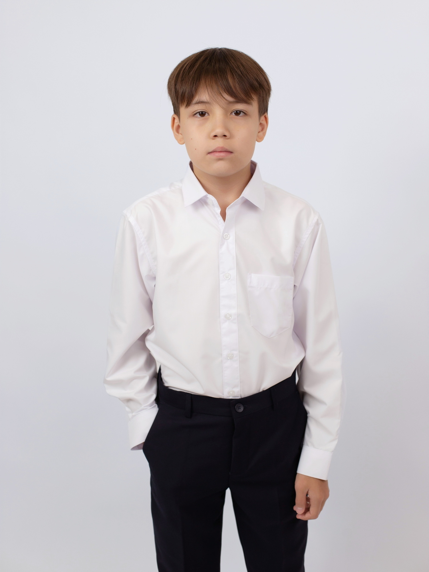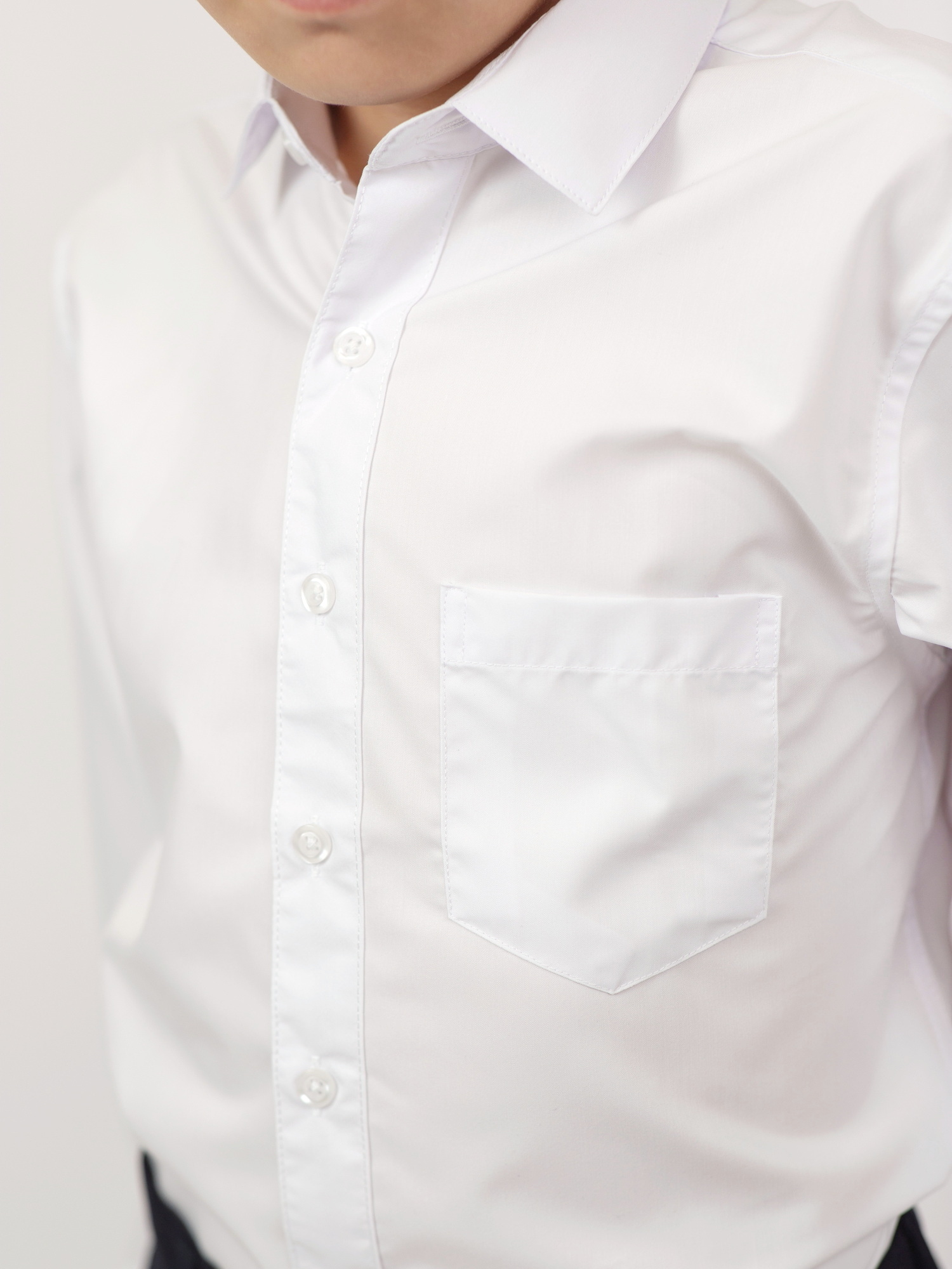 Сорочка для мальчика с аккуратным воротником-стойкой и удлинённой планкой застёжки. Полуприталенный силуэт подчёркивает аккуратный внешний вид, а мягкий, дышащий материал обеспечивает комфорт на протяжении всего дня. Манжеты на пуговицах удобно регулируются по ширине. Подходит как для школьной формы, так и для праздничных случаев.
