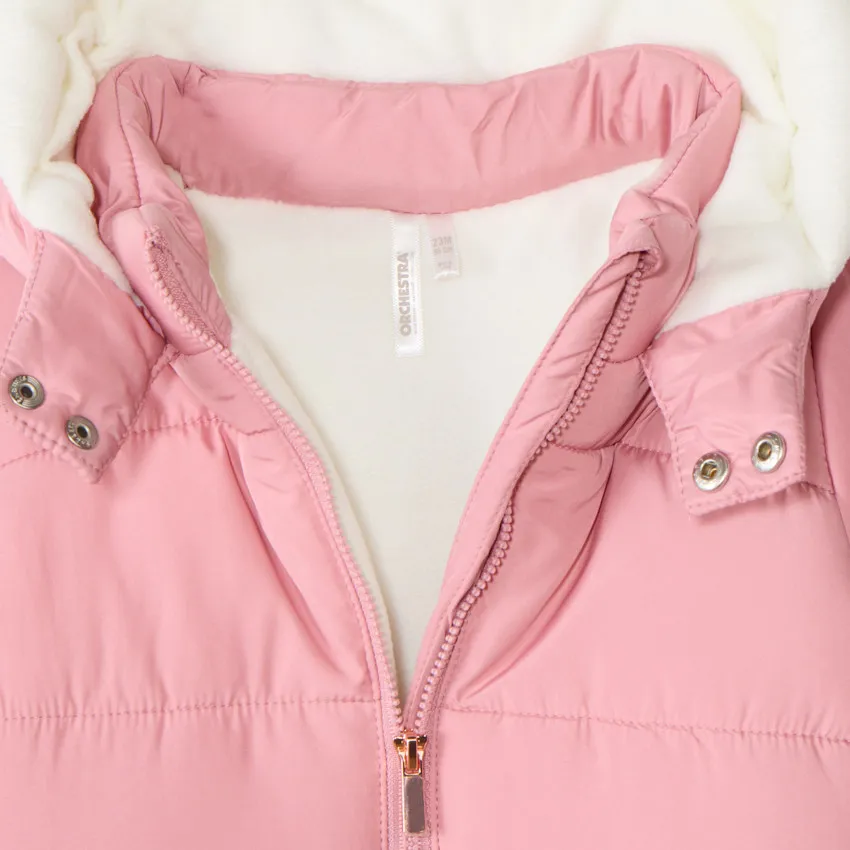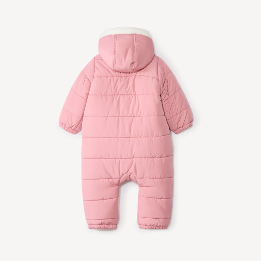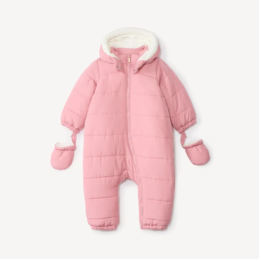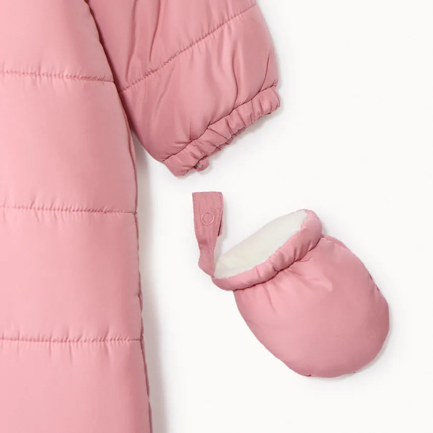 Детский комбинезон-пилот из стёганой ткани розового цвета. Оснащён капюшоном с застёжкой на кнопке спереди, полной молнией по центру и защитой для подбородка. Модель с длинными рукавами и разными вариантами отделки в зависимости от возраста: от 3 до 12 месяцев — с отворотами-варежками и закрытыми ножками, от 18 до 36 месяцев — со съёмными варежками на кнопках, эластичными манжетами и щиколотками. Внутренняя отделка выполнена из мягкого микрофлиса цвета экрю, утеплитель изготовлен из переработанных материалов.